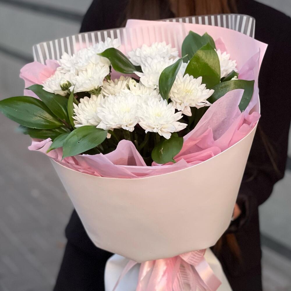 Букет из трёх белых хризантем с зеленью — это гармония простоты и элегантности, воплощённая в цветочной композиции. Каждая хризантема, словно символ преданности и искренности, раскрывает свои лепестки, играя с солнечными лучами и отражая свет яркими гранями. Их белоснежный цвет олицетворяет чистоту и невинность, превращая каждый взгляд на букет в ощущение умиротворения и радости.